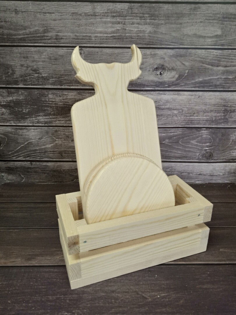 В комплекте: доска бык 19*39 см, круг 2 шт 20 см, ящик